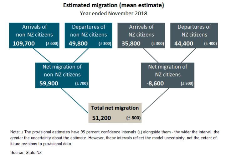 在截至2018年11月的过去一年中,约四分之三的入境移民是非新西兰公民(10.97万±600)。同一时期,只有刚刚超过一半的出境移民是非新西兰公民。