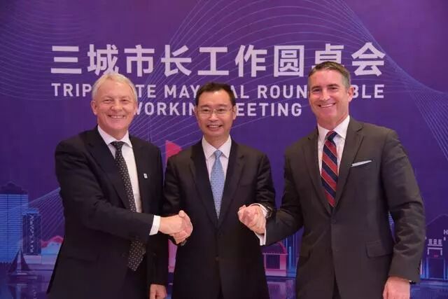 2017年广州举办三城经济峰会(左:高夫市长、广州市长温国辉、洛杉矶副市长格瑞尔)